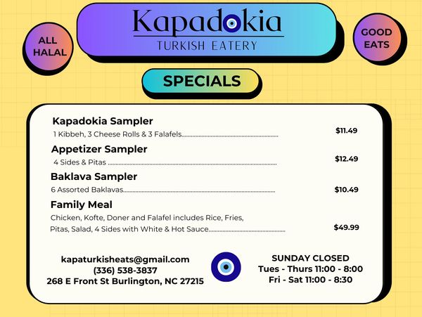 We are an independent Turkish-Mediterranean restaurant that began in Greensboro, NC, in 2023 and has since expanded to Burlington, NC.